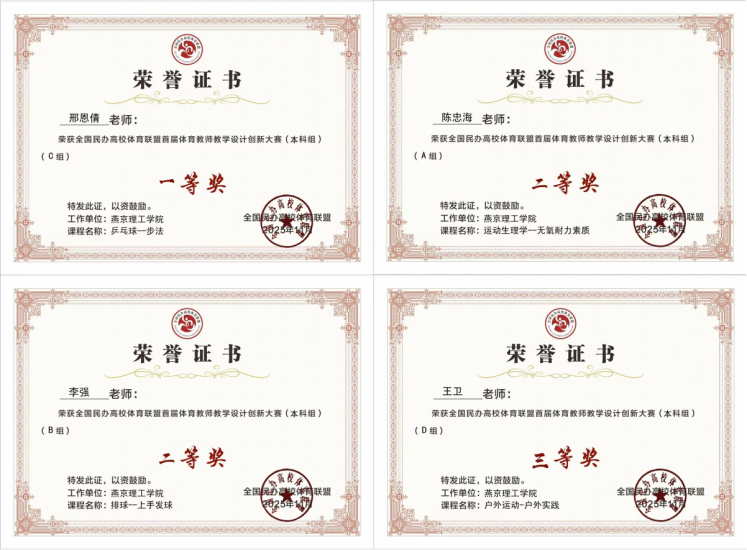 (体育学院新闻中心)为深入贯彻习近平总书记关于教育、体育工作的重要讲话精神,全面落实《关于全面加强和改进新时代学校体育工作的意见》,推动全国民办高校体育教育教学改革与创新,提升高校体育部主任及院长的管理能力与数字体育素养,提高体育教师的专业教学水平与创新能力,于全国民办高校体育联盟成立十周年之际, 2025年11月21日至24日在郑州升达经贸管理学院举办全国民办高校体育联盟体育部主任/院长培训暨首届体育教师教学设计创新大赛。 (获奖现场合影) 我校在新活力体育产业学院的组织下,由体育学院肖子一院长的带领下,陈忠海、邢恩倩、李强、王卫,4位老师参加了此次比赛。经过两天的激烈角逐,我校参赛教师凭借先进的教学理念、创新的课程设计和精湛的专业展示,在众多优秀作品中脱颖而出,赢得了评委的高度认可。邢恩倩老师荣获公共体育术科组一等奖,陈忠海老师荣获体育专业理论组二等奖,李强老师荣获体育专业术科组二等奖,王卫老师荣获特色项目术科组三等奖;此外,燕京理工学院因出色的赛事组织工作与教师团队的优异表现,被联盟授予“优秀组织奖”,这体现了联盟对我校体育教学整体水平、创新氛围及组织能力的高度肯定。 (荣誉证书展示) 赛场之上,邢恩倩老师教师突破传统桎梏,以独特视角重构《乒乓球》步法教学逻辑,思路迸发、环节精妙,每一步创新都彰显专业功底与育人巧思。陈忠海老师以 “学生为中心”推动《运动生理学》无氧耐力素质教学,从知识传授向能力素养培养转型,以赛促教优化课程教学体系;李强老师从理念革新到实践落地,教师深耕课堂细节,钻研教学《排球》上手发球的教学设计,用创新诠释教育初心;王卫老师以越野行走为核心设计《户外运动》课程,兼顾技能传授与安全、环保等素养培养,突出课程差异化优势及教学实效。 (比赛现场展示) 此次赛事不仅是对我校体育教师教学能力与创新水平的认可,更为体育学院的长远发展注入强劲动力,为未来教学工作开展指明清晰方向。后续,体育学院将以此次赛事为契机,进一步深化教学创新改革,推广优秀教学成果与创新经验,持续营造 “比学赶超” 的教学创新氛围,不断提升整体教学质量与教师专业素养,为培养高素质体育人才、推动学校体育教育事业高质量发展奠定坚实基础。 ——燕京理工学院体育学院新闻中心