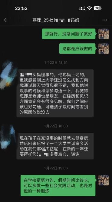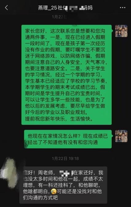 辅导员周振琪通过微信聊天和视频会议的线上形式,对所带专业班级62名学生家长开展线上家访,在交流中拉近家校距离,实现家校共育。 周老师通过线上会议以及微信聊天的方式与62位学生家长开展线上家访,此次家访拉近了学校与学生家庭之家的距离,让家校共育的成效进一步深化。 周老师在与周同学家长进行沟通的过程中,针对家庭与孩子之间的沟通问题进行了探讨,从老师的角度对学生进行分析,让家长了解了自己孩子在学校的状态,并针对与与学生沟通之间的问题进行了交流,让家长能够更好的在家庭中与孩子沟通交流。 贲同学在学校期间因身体问题请了假,假期期间进行了复查,周老师及时跟进学生的复查情况,得知学生没有大问题后,向学生家长告知了假期在家期间可以参与的社会实践,学生在家同样也在坚持进行身体锻炼,保证身体健康。 家校携手,是教育最美的模样;体育赋能,是成长最强的动力。燕京理工学院体育学院此次寒假“大家访”活动,有效打通了家校沟通的“最后一公里”,凝聚了育人合力,为学生的全面发展和专业成长筑牢了根基。未来,学院将持续深化家校协同育人机制,把家访活动的成效转化为常态化教育举措,让思想政治教育更有温度、专业人才培养更有力度,助力每一位体育学子在青春赛道上奋力拼搏、逐梦前行。 ——燕京理工学院体育学院新闻中心